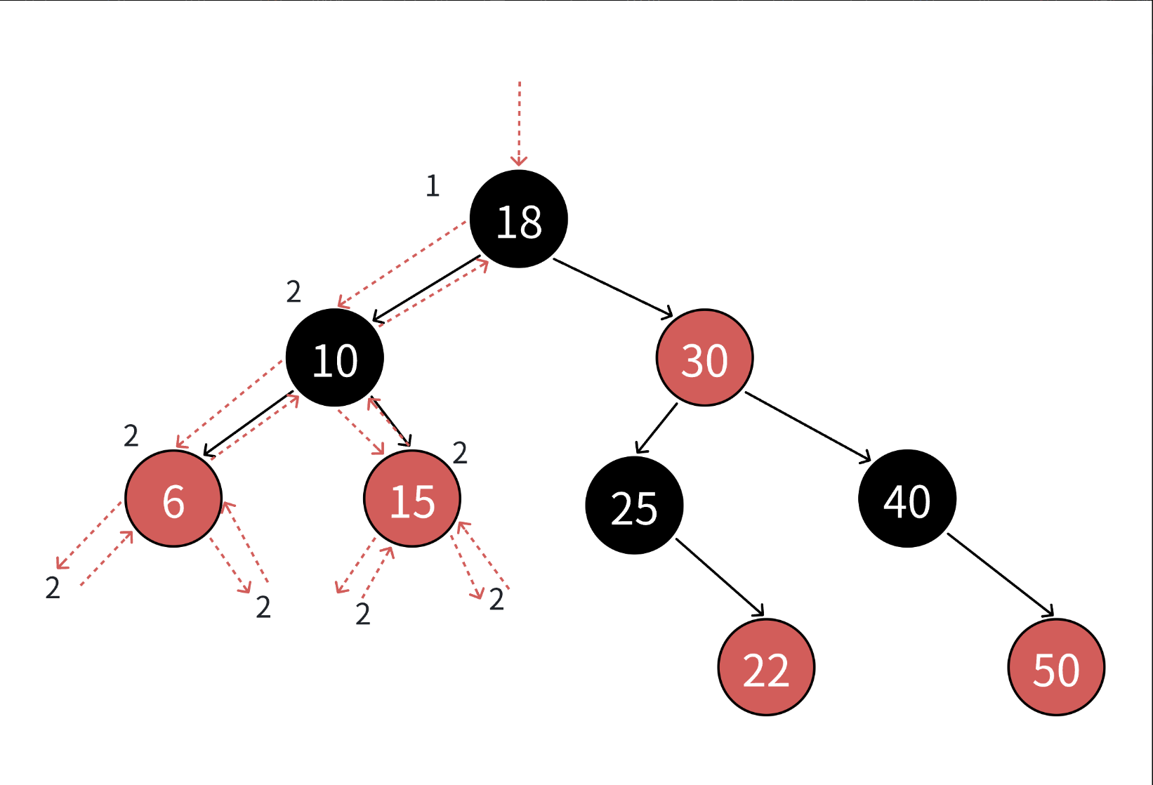 4. 规则4前序遍历,遍历过程中⽤形参记录跟到当前结点的blackNum(⿊⾊结点数量),前序遍历遇到⿊⾊结点就++blackNum,⾛到空就计算出了⼀条路径的⿊⾊结点数量。再任意⼀条路径⿊⾊结点数量作为参考值,依次⽐较即可。