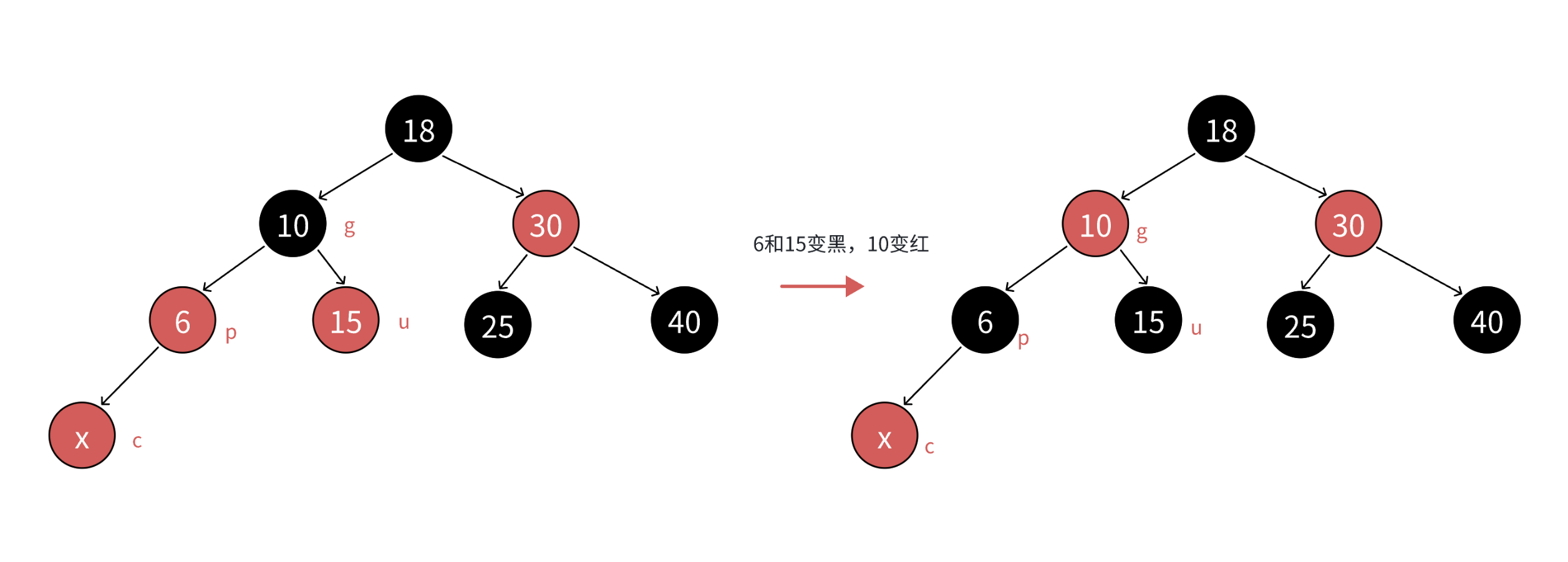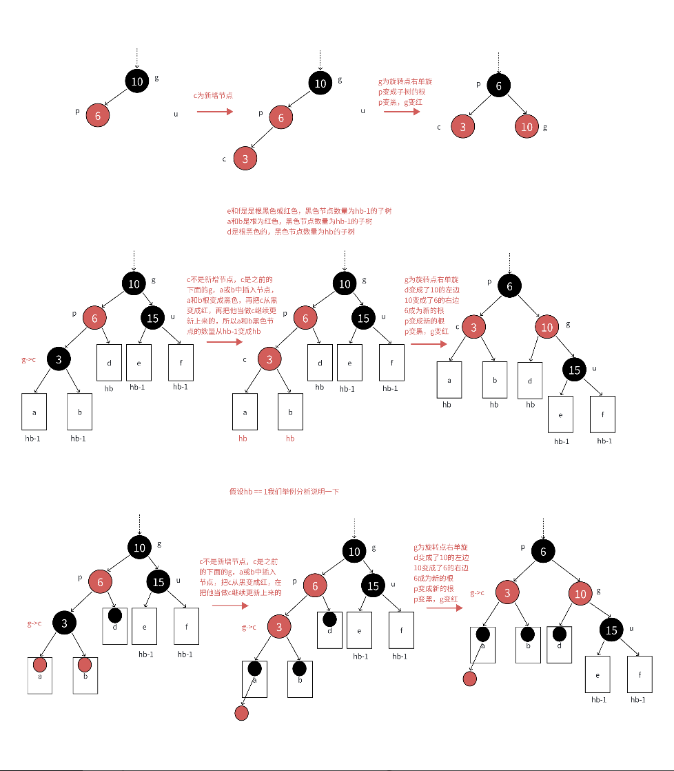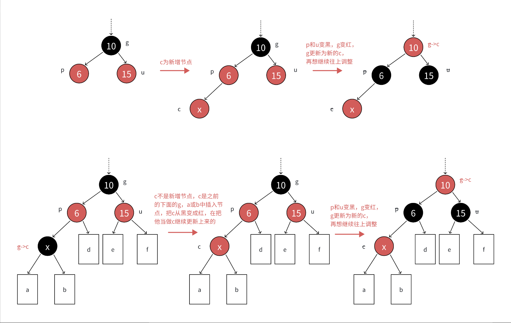 c为红,p为红,g为⿊,u存在且为红,则将p和u变⿊,g变红。在把g当做新的c,继续往上更新。