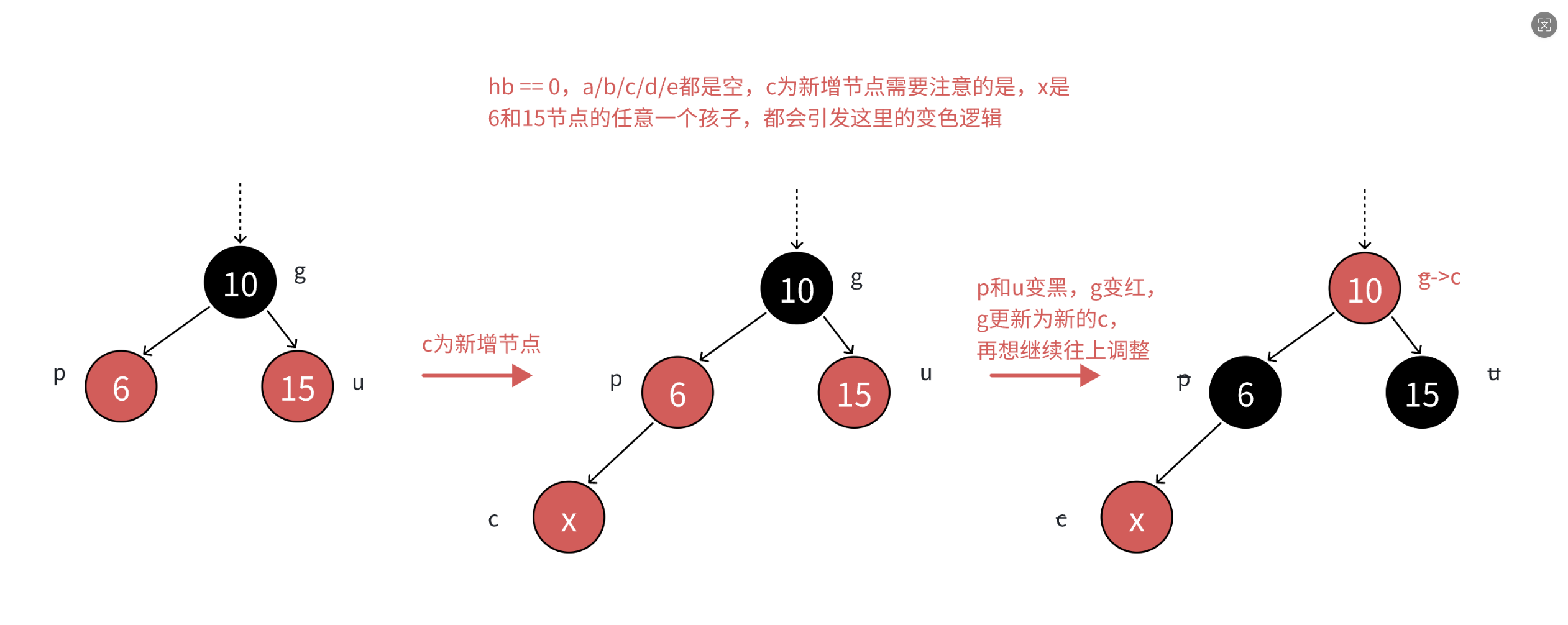 这个也是比较好理解的,我们可以来理解一下,u为黑色结点,但是p为红色结点,说明p的左右孩子子树上都是存在黑色结点的,所以此时的c不可能是新增的。