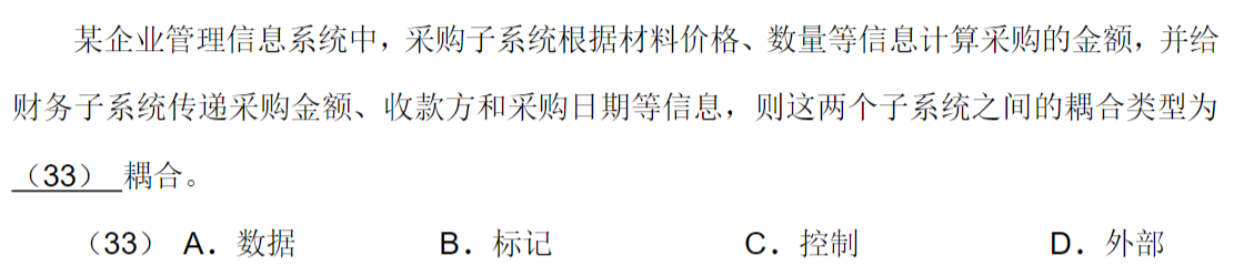 B. 标记耦合:如果传递的是整个采购订单对象(包含金额、收款方、日期等,但可能还有其他字段),而财务子系统只使用部分字段,才属于标记耦合。但题干强调传递的是具体信息(金额、收款方、日期),没有提到多余字段,因此更偏向数据耦合。