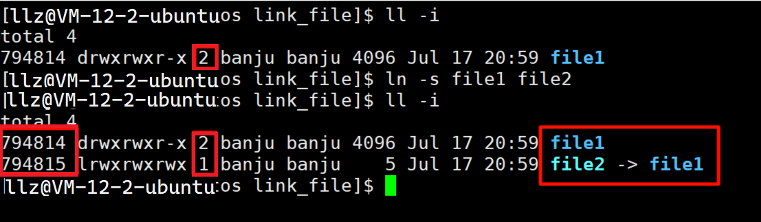 test.cc与file_link共享 inode,硬链接数变为 2。- 删除文件的判定规则:删除某个指向 inode 的文件名时,硬链接数会减 1;只有当硬链接数降至 0 时,操作系统才会认定 “无文件名指向该 inode”,此时才会释放磁盘空间,真正删除文件数据。