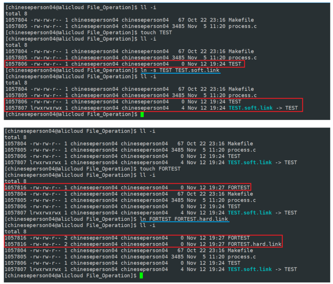 下面我分别创建两个文件,并分别创建软链接和硬链接,实验结果如下,我们发现创建软链接的文件和软链接文件的inode编号不同,但是创建硬链接的文件和硬链接文件的inode编号却相同。