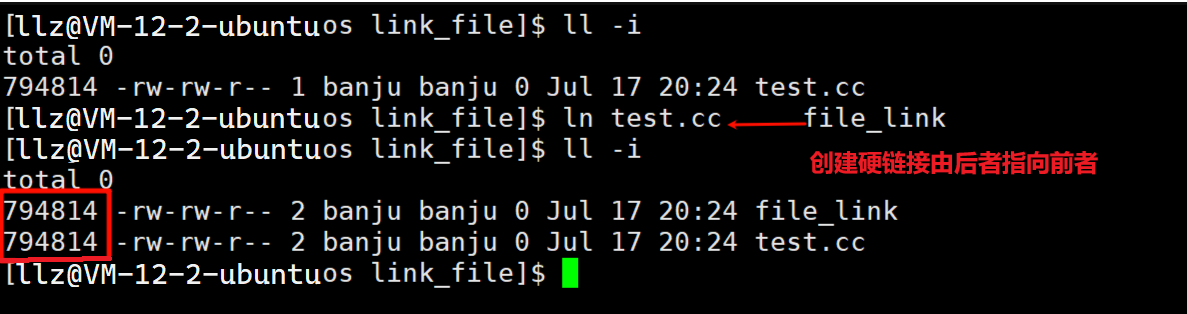 test.cc的硬链接数为 1(仅自身文件名指向其 inode)。- 创建硬链接后: