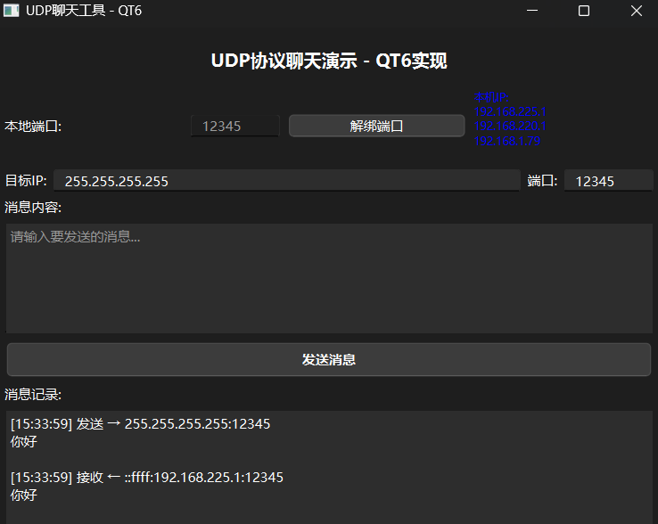 {ui->setupUi(this);// 设置默认端口ui->portEdit->setText("12345");ui->targetPort->setText("12345");ui->targetIP->setText("127.0.0.1");// 连接信号槽connect(udpSocket, &QUdpSocket::readyRead,this, &MainWindow::processPendingDatagrams);// 获取本机IP地址并显示QString localIPs;QList<QHostAddress> ipAddressesList = QNetworkInterface::allAddresses();for (const QHostAddress &address : ipAddressesList) {if (address.protocol() == QAbstractSocket::IPv4Protocol &&address != QHostAddress::LocalHost) {localIPs += address.toString() + "\n";}}ui->localIPLabel->setText("本机IP:\n" + localIPs);updateStatus("准备就绪 - 请先绑定端口");