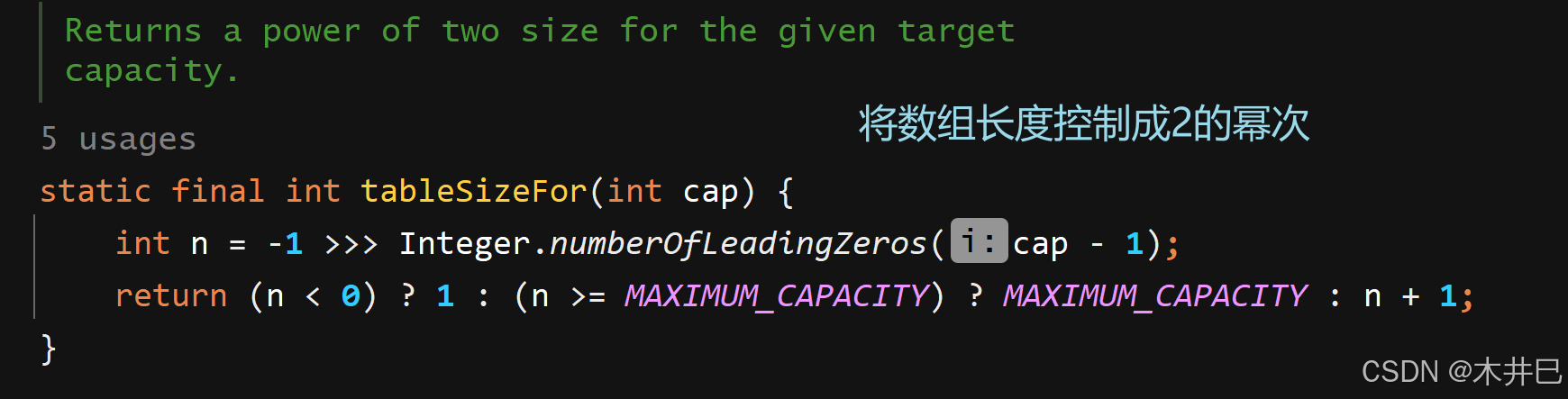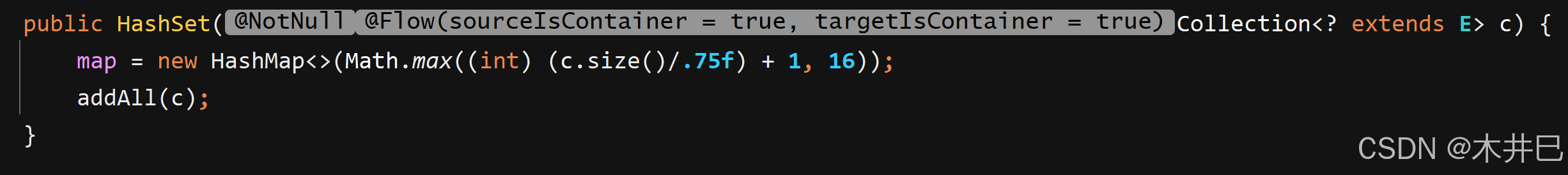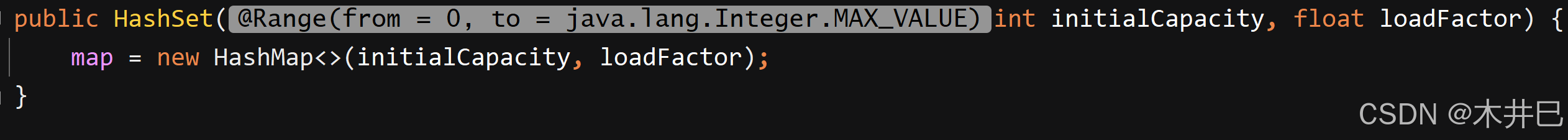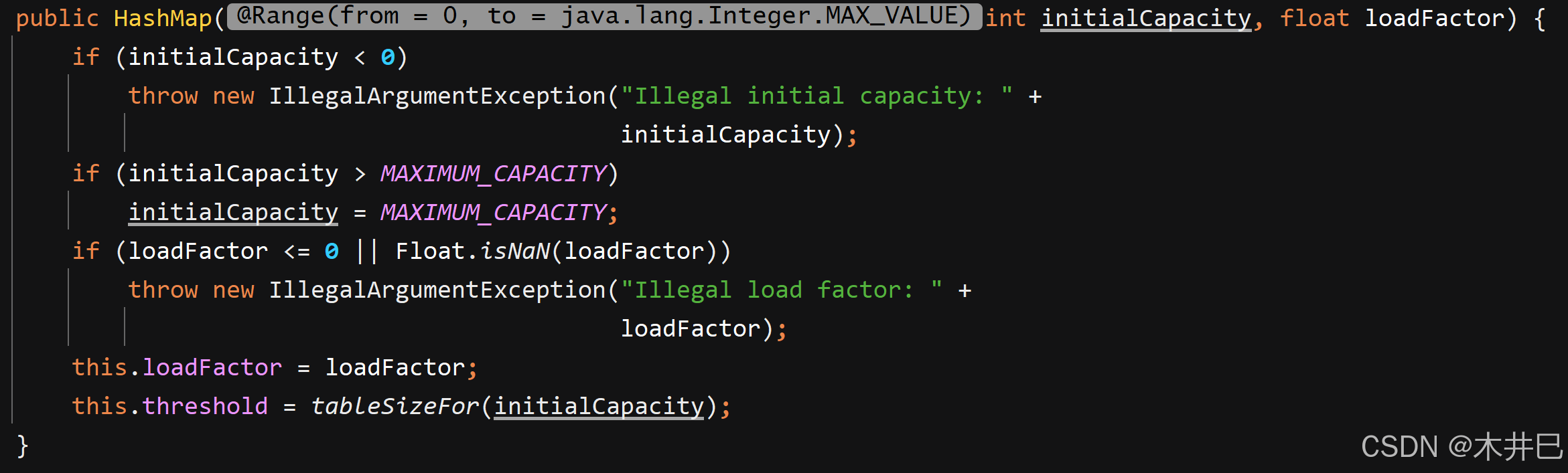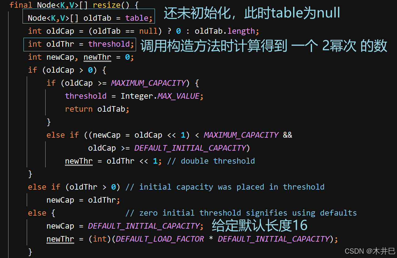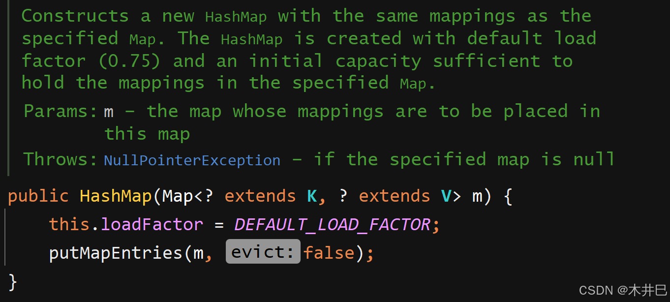 该构造方法将指定的原来默认的载荷因子改成传入的指定载荷因子,然后将传入的指定数组长度改成2的幂次(比如传入的指定长度为10,返回的值是16,因为16是2的4次方)