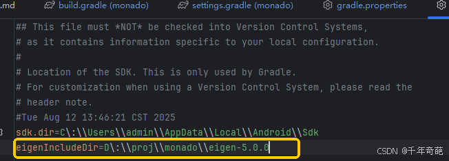 https://eigen.tuxfamily.org/index.php?title=Main_Page - 打开monado目录下的local.properties文件,在文件末尾添加一行eigenIncludeDir=D:\proj\monado\eigen-5.0.0