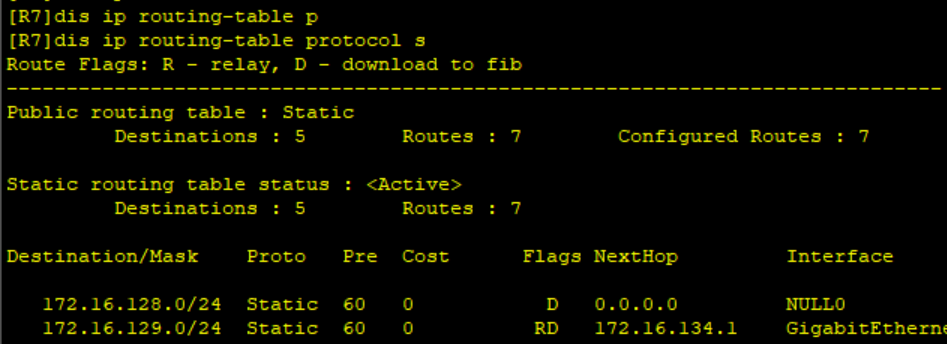 [R7]ip route-static 172.16.129.0 24 172.16.134.1
