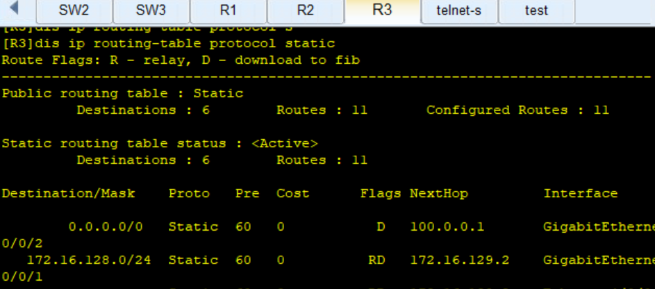 [R3]ip route-static 172.16.128.0 24 172.16.130.2 pre 100