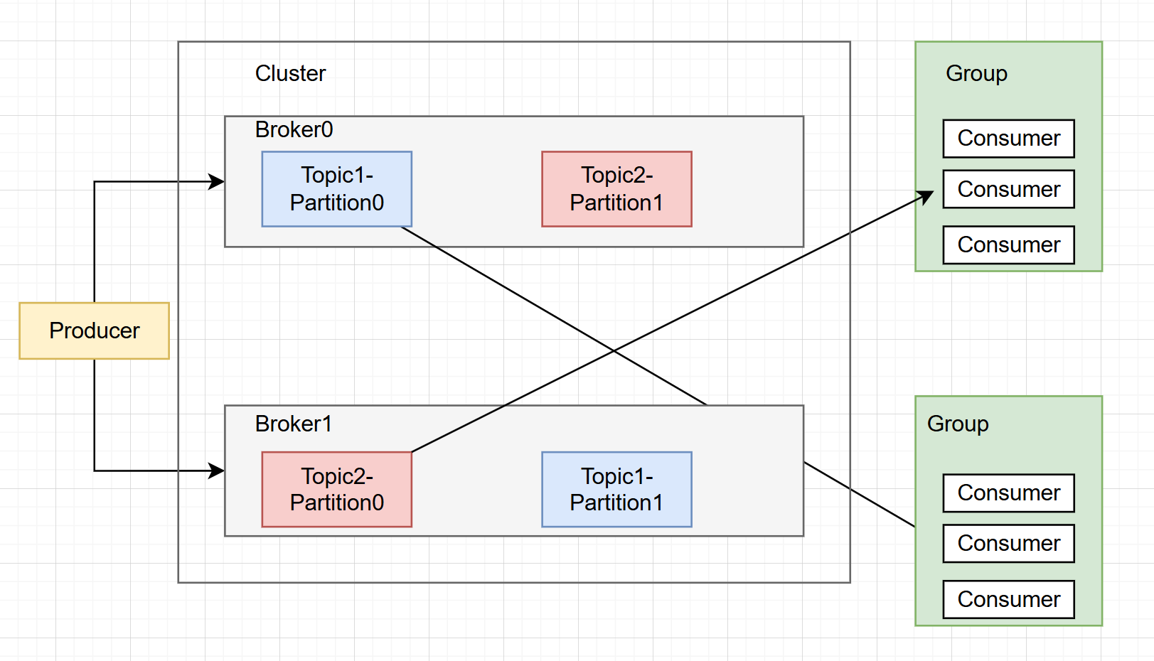 - 消费组(Consumer Group):多个消费者组成一个消费组,共同消费一个 Topic 的分区,每个分区只能被消费组内的一个消费者消费(避免重复消费)。