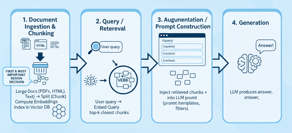 文档摄取与分块 处理大型文档(PDF、HTML、原始文本)→ 分割(“分块”)→ 计算嵌入向量 → 在向量DB中建立索引。