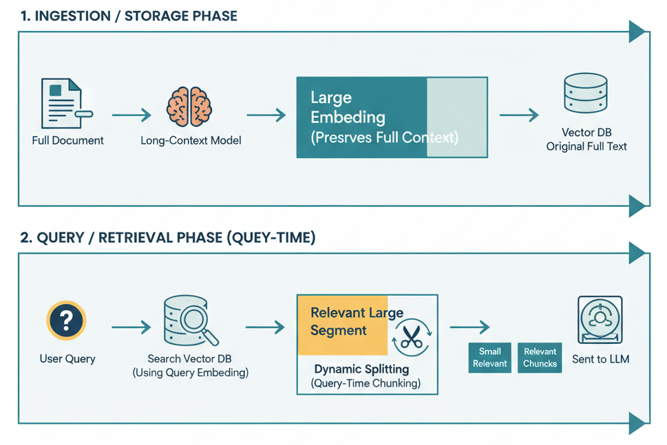 延迟分块意味着将文档的分割方式推迟到查询时。不是预先将所有内容分割,而是存储较大的片段或整个文档。当查询到来时,只有相关的片段才会被动态分割(或过滤)。这样做的目的是在嵌入过程中保留完整的上下文,只在必要时进行分解。