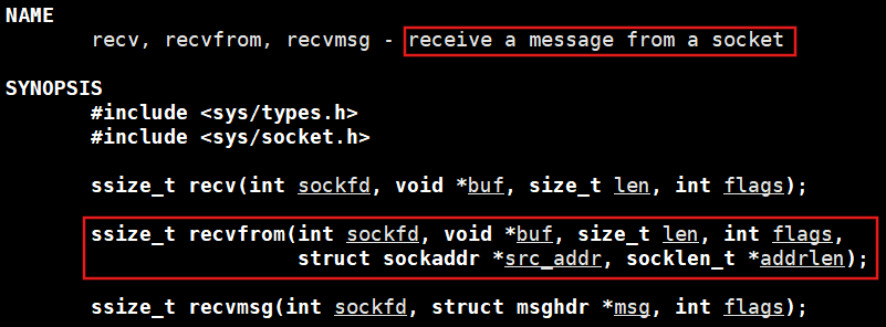 第一个参数就是套接字;第二个参数是接收数据的缓冲区;第三个参数是这个缓冲区的大小;第四个参数是阻塞IO或者非阻塞IO,阻塞式IO就是没有收到数据的时候进程会一直等,就等同于scanf,这里设置成0,表示默认非阻塞;第四个参数用于存储发送数据的对端的ip和端口号(即记录寄件人地址);第四个参数是src_addr的实际大小。
