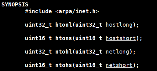 - h表示host,n表示network,l表示32位长整数,s表示16位短整数,例如 htonl 表⽰将 32 位的⻓整数从主机字节序转换为⽹络字节序