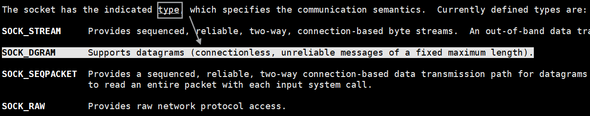 - 第二个参数要创建的套接字类型,也有很多,传SOCK_DGRAM