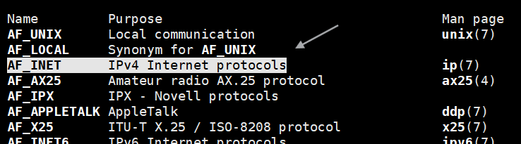- 第一个参数就是要做什么通信,有很多选项,进行网络通信就传AF_INET;