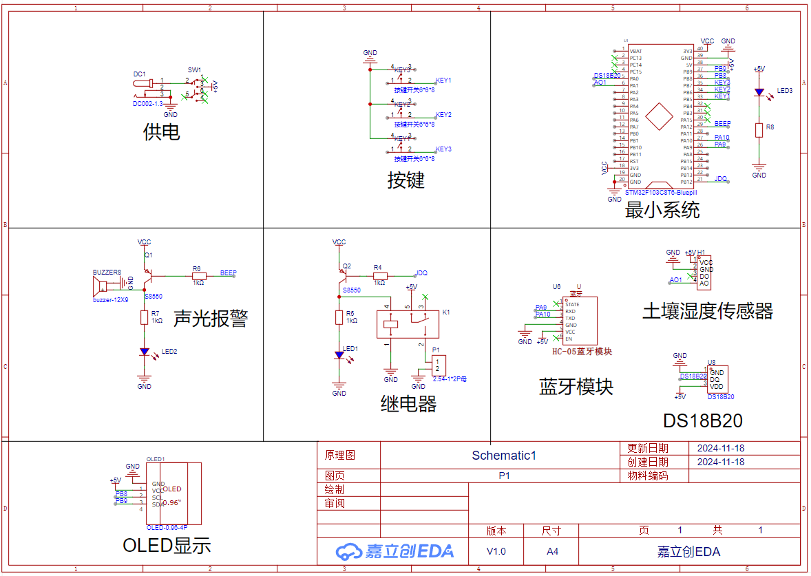 {delay_init();NVIC_PriorityGroupConfig(NVIC_PriorityGroup_2);OLED_Init();delay_ms(1);OLED_Clear();output_init();input_init();Usart1_Init(9600);Usart2_Init(9600);DS18B20_Init();Adc_Init();while(1){wifi();temp_get();count++;sw=100-Get_Adc_Average(1,10)*100/4096; key_scan(1,0,0);if((set_flag==1 && show_flag!=1) || res=='a'){res=0;OLED_Clear();show1_flag=0;set_flag=0;show_flag++;if(show_flag>=2){show_flag=0;}}if(show_flag==0){OLED_ShowCH(0,0,"智能植物灌溉系统");OLED_ShowCH(0,2,"温度:");OLED_ShowNum(40,2,wd,2,16);OLED_ShowCH(64,2,"土湿:");OLED_ShowNum(104,2,sw,2,16);OLED_ShowCH(0,4,"灌溉:");if(jdq1==0){OLED_ShowCH(40,4,"打开");}else{OLED_ShowCH(40,4,"关闭");}if(add_flag==1){mode_flag++;add_flag=0;if(mode_flag>=2)mode_flag=0;}if(mode_flag==0){BEEP=1;OLED_ShowCH(0,6,"手动模式");if(dec_flag==1){dec_flag=0;jdq1=~jdq1;}}else{OLED_ShowCH(0,6,"自动模式");if(sw<=dec_ts || wd>=dec_gz){jdq1=0;BEEP=0;}else{jdq1=1;BEEP=1;}}}if(show_flag==1){OLED_ShowCH(0,0,"最高温度:");OLED_ShowCH(0,2,"最低土湿:");OLED_ShowNum(72,0,dec_gz,2,16);OLED_ShowNum(72,2,dec_ts,2,16);if((set_flag==1 && show_flag==1) || res=='b'){res=0;set_flag=0;show1_flag++;if(show1_flag>=2){show_flag=0; OLED_Clear();}}if(show1_flag==0){OLED_ShowCH(112,0,"←");if(add_flag==1 || res=='c'){res=0;add_flag=0;dec_gz++;}if(dec_flag==1 || res=='d'){res=0;dec_flag=0;dec_gz--;}if(dec_gz>=100 || dec_gz<=0){dec_gz=0;}}if(show1_flag==1){OLED_ShowCH(112,2,"←");if(add_flag==1 || res=='c'){res=0;add_flag=0;dec_ts++;}if(dec_flag==1 || res=='d'){res=0;dec_flag=0;dec_ts--;}if(dec_ts>=100 || dec_ts<=0){dec_ts=0;}}}if(count>=50){count=0;UsartPrintf(USART1,"温度:%f\r\n",wd);UsartPrintf(USART1,"土湿:%d\r\n",sw);if(jdq1==0)UsartPrintf(USART1,"灌溉继电器已打开\r\n");elseUsartPrintf(USART1,"灌溉继电器已关闭\r\n");UsartPrintf(USART1,"\r\n");}}