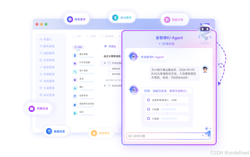 在研究金智维Ki-AgentS的场景演示时,我们能够发现,该平台将RPA(机器人流程自动化)与大模型深度融合,不仅实现从“规则驱动”向“认知驱动”的跃升,还提供灵活易用、多场景适配的构建机制,让智能体嵌入金融机构核心流程,成为高效、合规的“数字同事”。