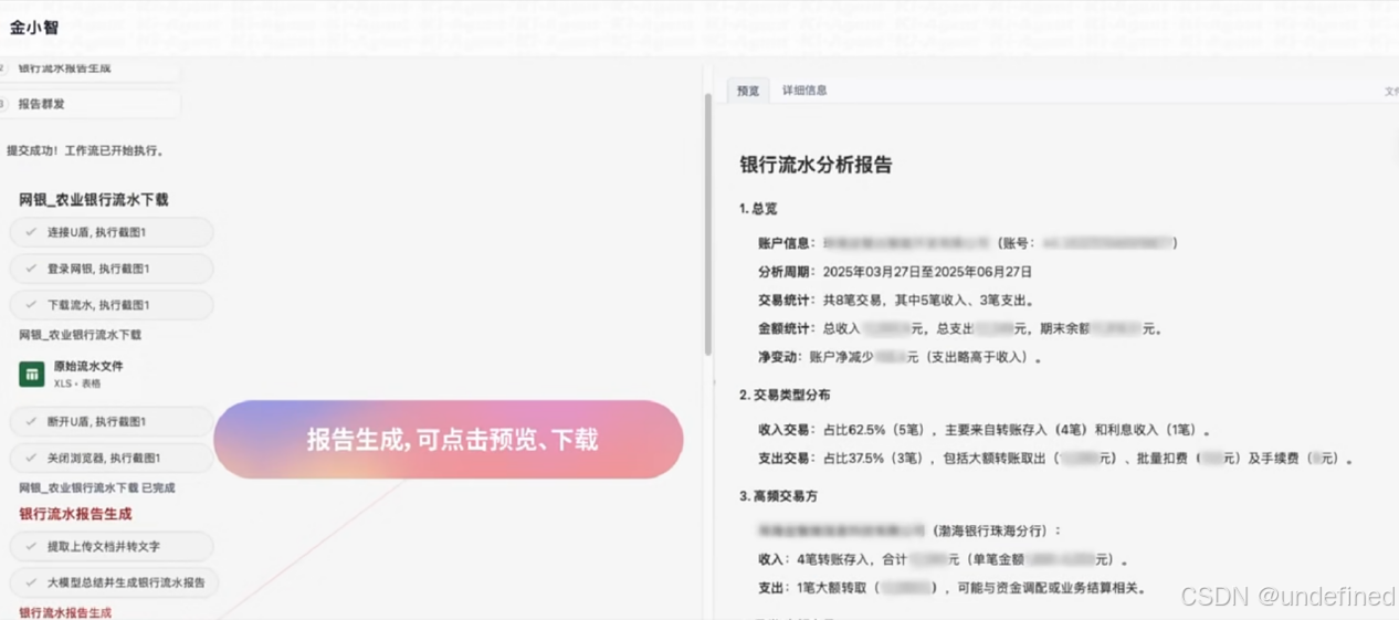 以银行流水分析为例,用户简单指令即可端到端自动化网银登录、数据提取、解析与报告分发,将1小时以上核查压缩至8分钟,生成可追溯报告并定向推送,帮助财务人员聚焦高价值决策。在债券报告分析中,智能体平台融合大模型语义理解与RPA操控,在数分钟内从数百页面提取关键要素(如担保措施、偿债计划),生成逻辑严谨的评估报告,效率提升90%以上,全程留痕满足合规要求。类似的,在券商舆情监测中,智能体实时聚合数据、生成初稿分析,显著缩短投研周期。