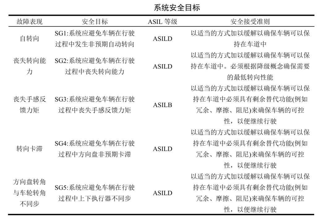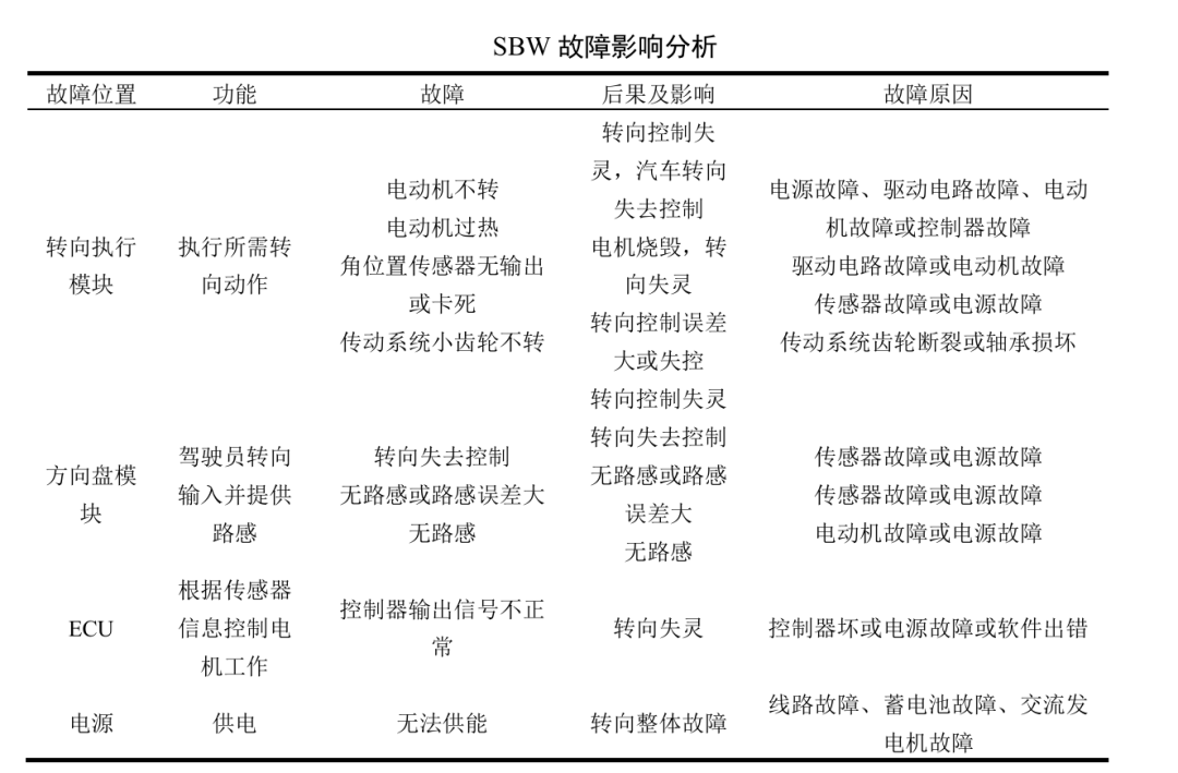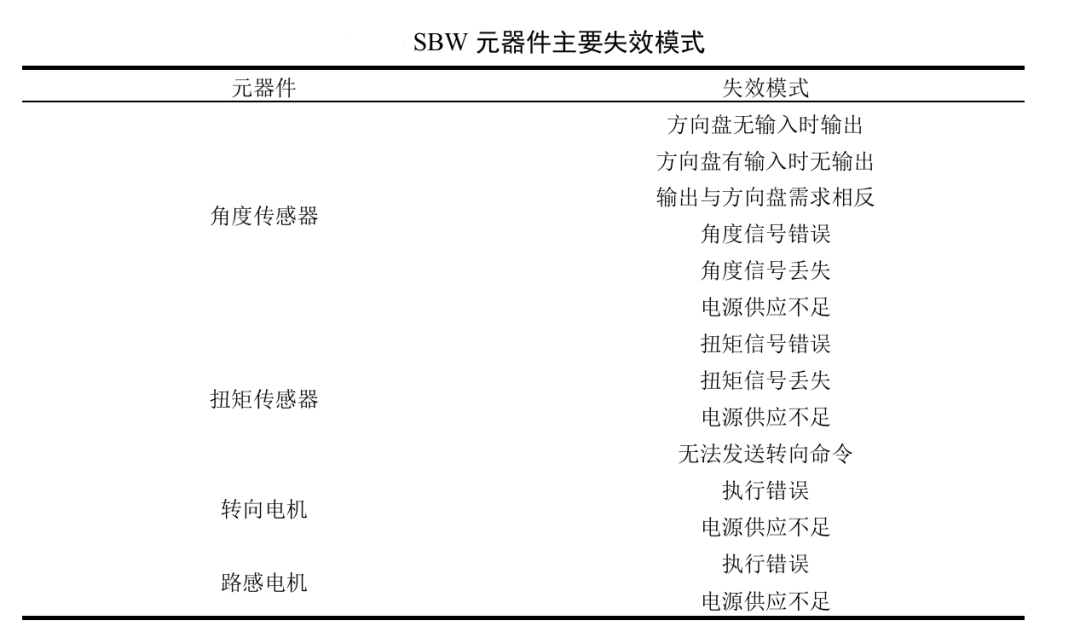 总的来说系统功能失效主要表现为以下几种情况: (1)系统功能完全丧失,启动后没有任何响应,无法正常工作; (2)系统功能出现偏差,启动后提供的功能与预期不一致,可能超出、低于 或与预期相反; (3)系统出现非预期功能,启动后表现出与设计目标不同的功能; (4)系统卡死,启动后进入某种状态不变。线控转向系统的主要失效因素包括: