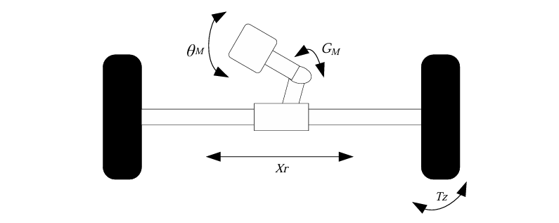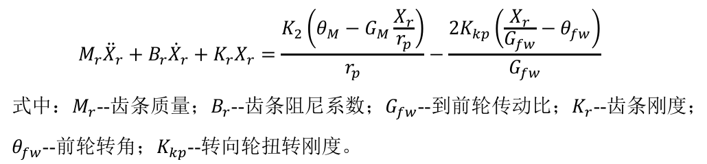 齿轮齿条通过转向电机的带动进而工作,将电机的旋转运动转换为齿条的 横向运动,进而带动车轮进行转向。根据动力学平衡方程,可得齿轮齿条机构 部分的微分方程: