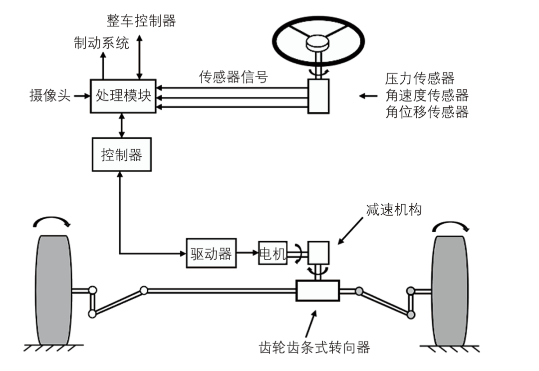 控制器(EPS ECU):根据处理模块的指令,结合车辆状态(如车速,图中未画出车速传感器但属于常规配置),计算出电机所需的助力扭矩和动作指令。