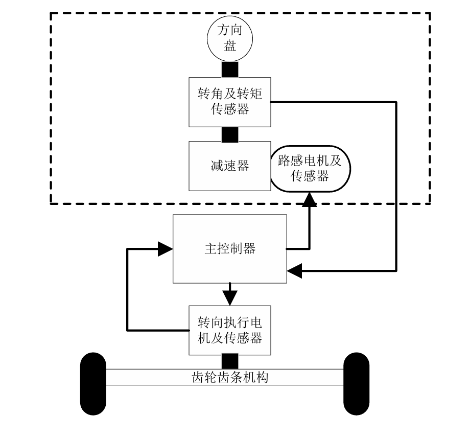 线控转向系统的工作原理和传统转向系统有所不同。汽车转向时,控制器可计算出转向执行电机电流大小,并将电流信号传递给转向执行电机,使转向电机输出合适的扭矩。进而齿轮齿条机构运动,带动前轮扭转,实现车辆的转 向。同时,根据路面情况不同,路感电机模拟出符合行驶状态的力矩,帮助驾驶员感知路面状态信息。
