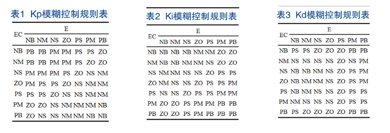 选择PB(正大)、PM(正中)、PS(正小)、 ZO(零)、NB(负大)、NM(负中)、NS(负小)作为语言 变量来构建模糊规则。在PID控制器中,Kp决定了 控制器对当前误差的响应强度,增大Kp会使系统响 应更快,但如果Kp过大,可能导致系统产生较大的 超调和振荡;Ki的目的是消除系统的稳态误差,确 保系统最终能达到目标值,增加Ki会加快消除稳态 误差的速度,但如果Ki过大,可能导致系统不稳定 和振荡。Kd的目的是预测误差的变化趋势,从而对 控制器输出进行修正,减小误差变化的速度。综上 所述,PID参数的模糊规则可归纳为下表