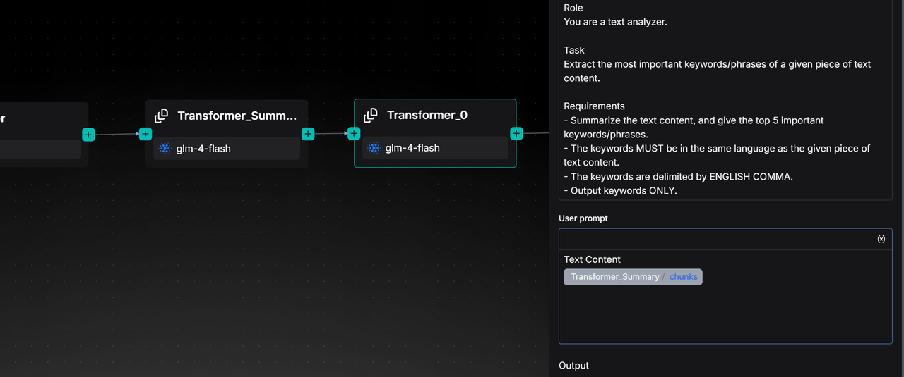 同理,当用户选择串联多个 Transformer 节点时(例如,第一个生成 Summary,第二个生成 Keywords),如果第二个 Transformer 引用的是第一个 Transformer 生成的 Summary 变量,那么它会把这段 Summary 作为“新的原文”来进行加工,而不是处理更上游的 Chunker 文本块。