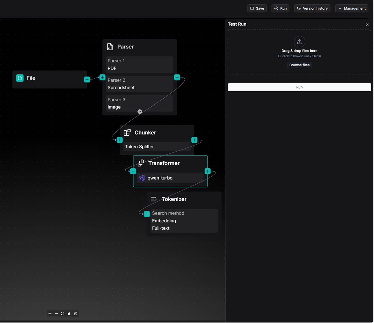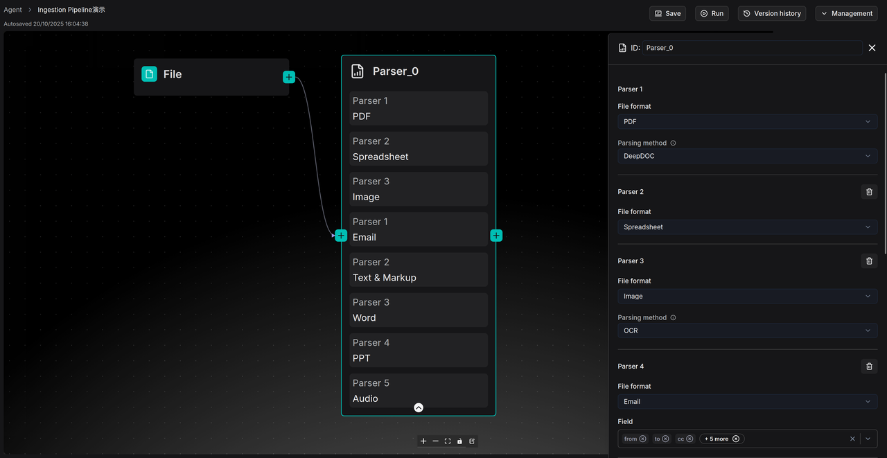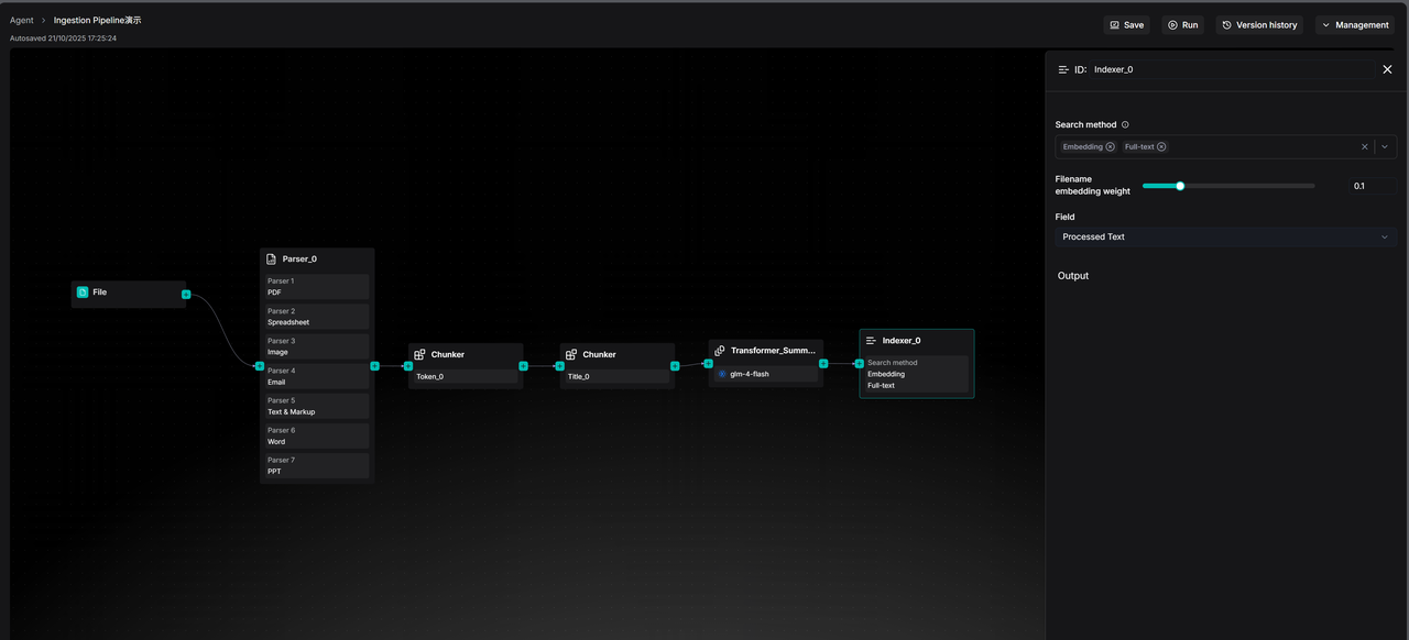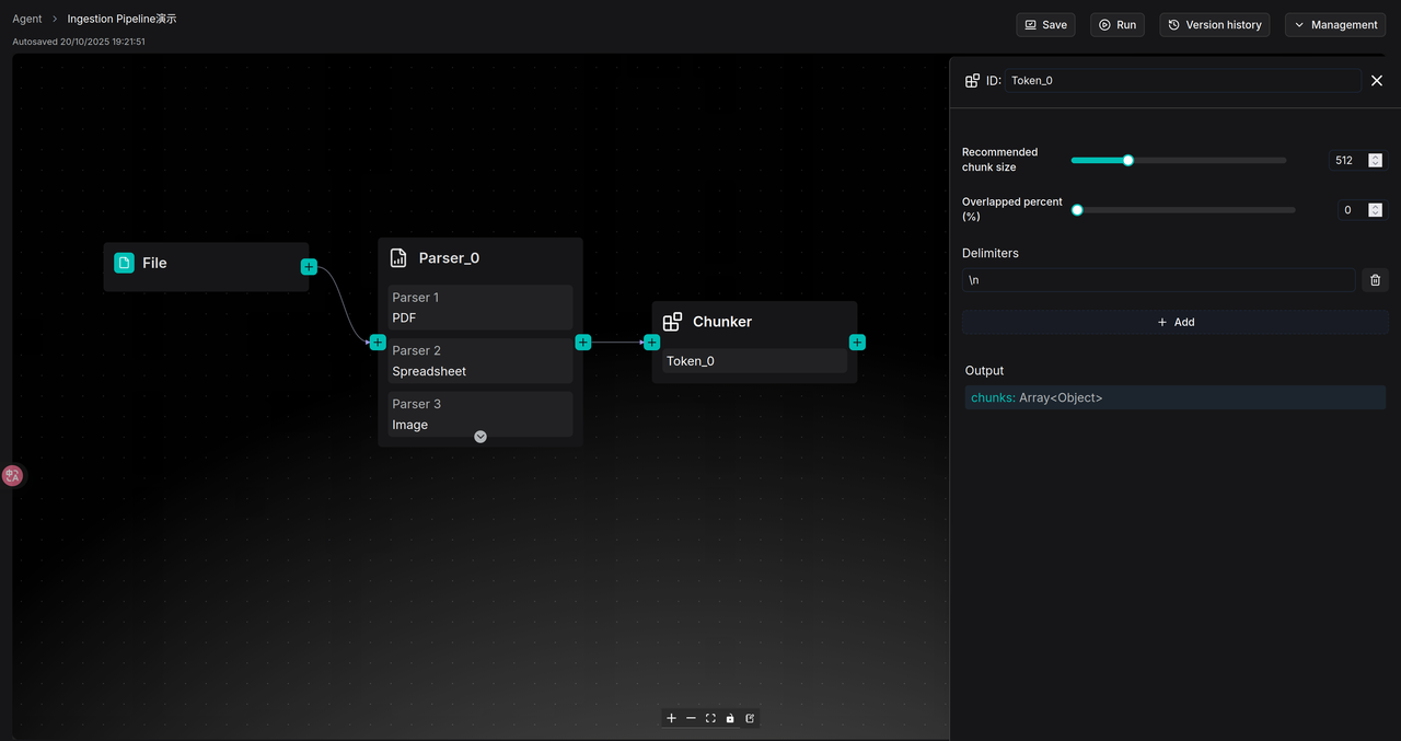为此,在 RAGFlow 0.21.0 中重磅推出了 Ingestion pipeline。它重构了非结构化数据的清洗流程,允许用户根据具体业务,构建定制化的数据处理链路,实现对异构文档的精准解析。