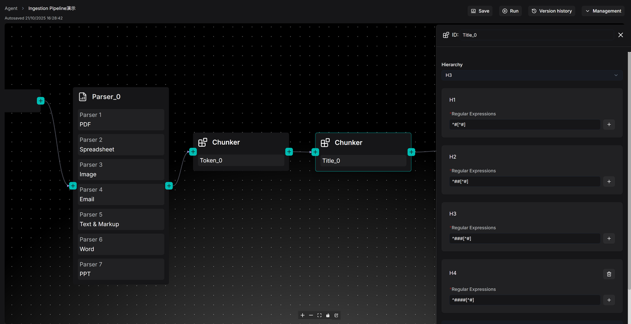 注意:在当前的 RAGFlow v0.21 版本中,如果同时编排 Chunker 的 Token 和 Title 选项,请保证 Title 节点接在 Token 节点之后,否则若 Titile 节点直接连接 Parser 节点,则 Email, Image, Spreadsheet, Text&Markup 类型文件会出现格式报错。这些限制将在后续版本里得到优化。