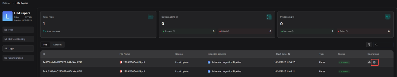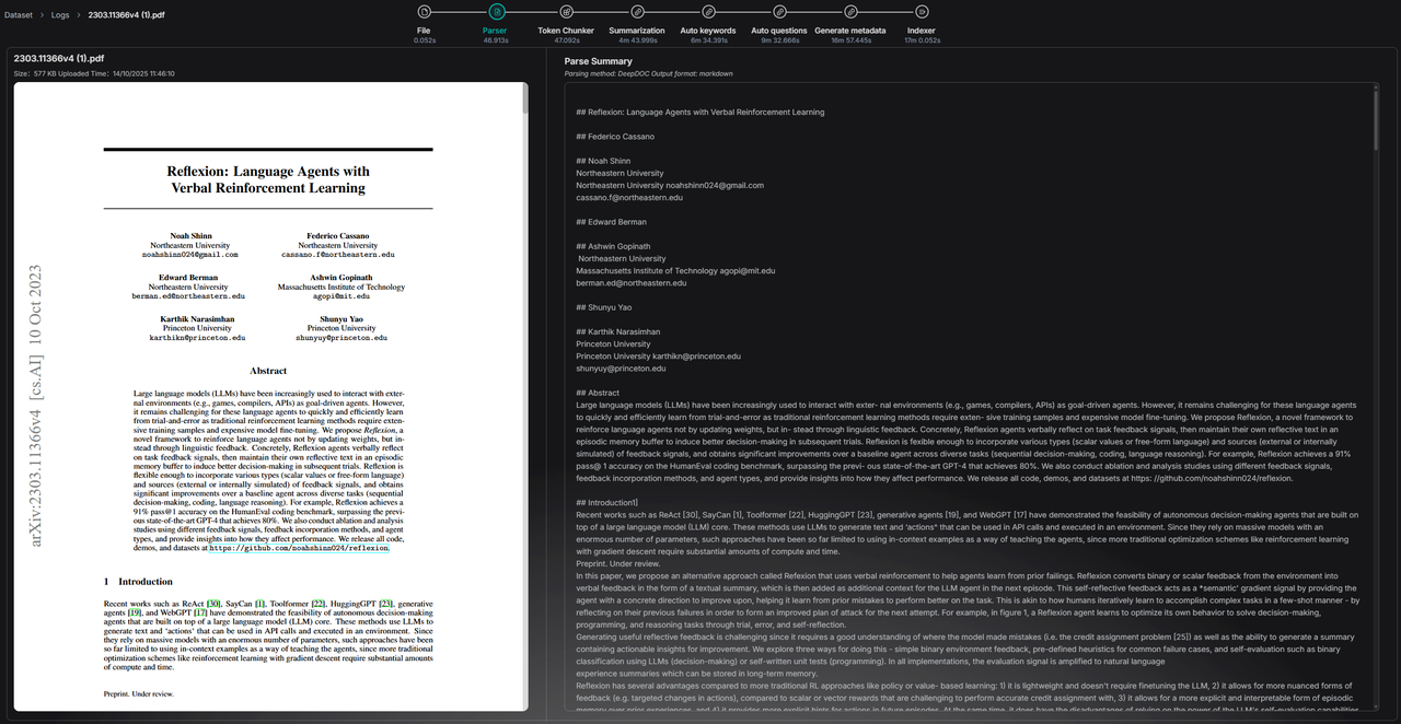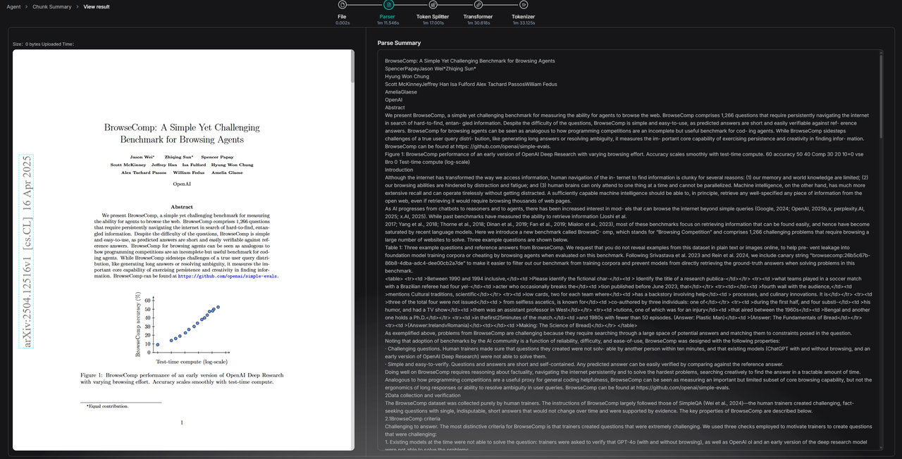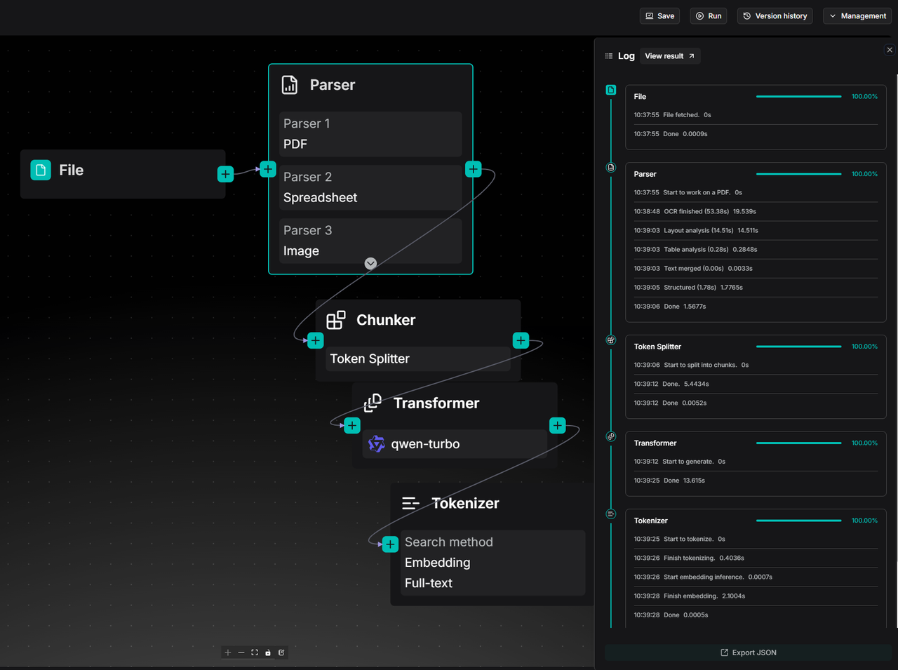 Ingestion Pipeline 的执行可能会耗时较长,因此可观测性是不可或缺的能力,为此 RAGFlow 为 Ingestion pipeline 提供了日志面板,用于记录每一次文件解析的全链路日志。对于通过 Ingestion Pipeline 解析的文件,用户可以深入查看其每个处理节点的运行详情。这为后续问题审计、流程调试与效果洞察提供了完整的数据支持。