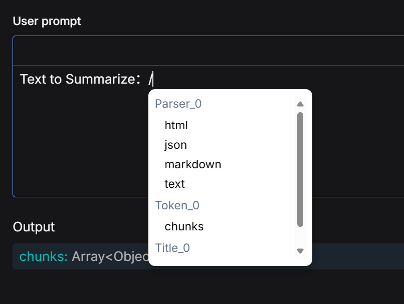 例如:在一个 Parser -> Chunker -> Transformer 的 Pipeline 中,尽管 Transformer 视觉上连接在 Chunker 之后,但如果在 User prompt 中引用的变量是 Parser 节点的输出,那么 Transformer 实际加工的仍然是整篇原文,而不是 Chunker 切割后的 chunks。