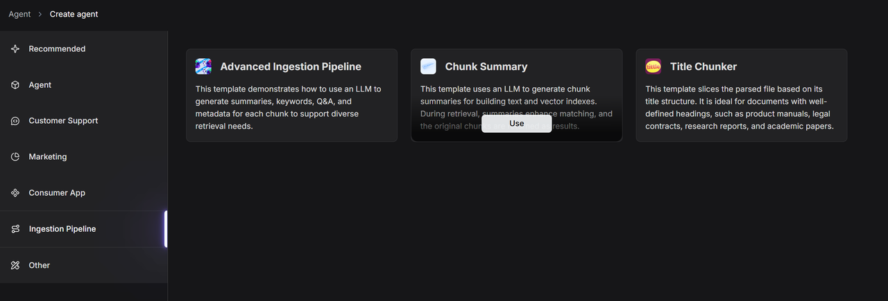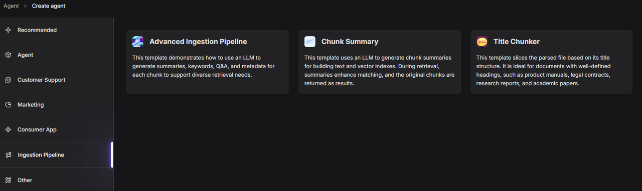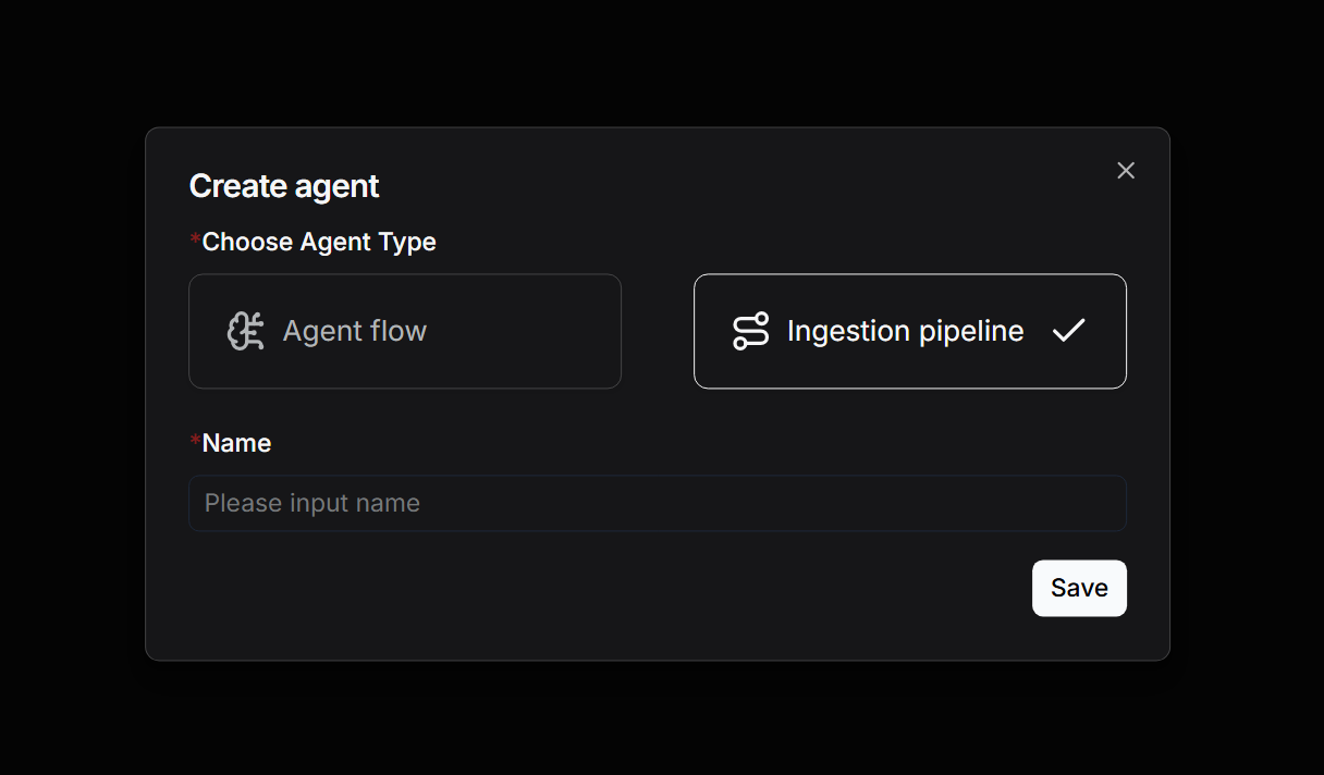 首先在 “Agent” 页面点击 “Create agent”,可以选择 “Create from blank” 从空白创建 Ingestion Pipeline: