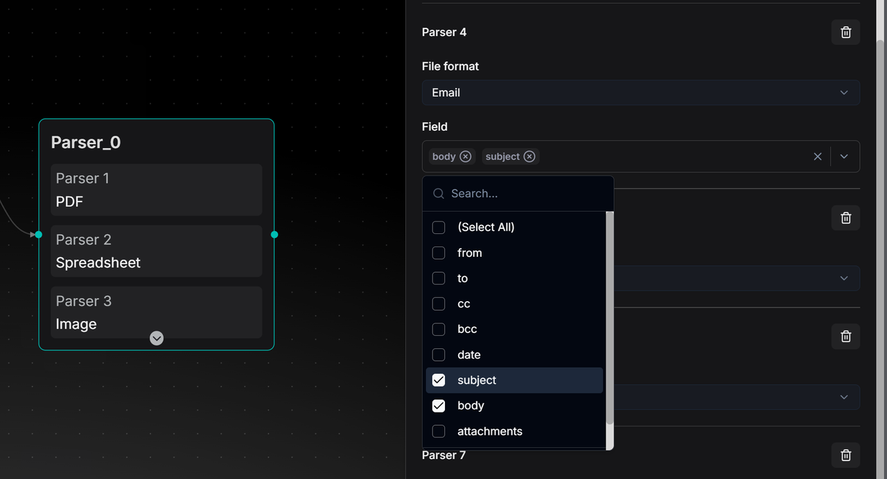 在解析 Email 文件时,RAGFlow 提供了 Field 选项,用户可以只勾选想要的字段,例如“subject”和“body”,Parser 会精确提取这些字段的文字内容。
