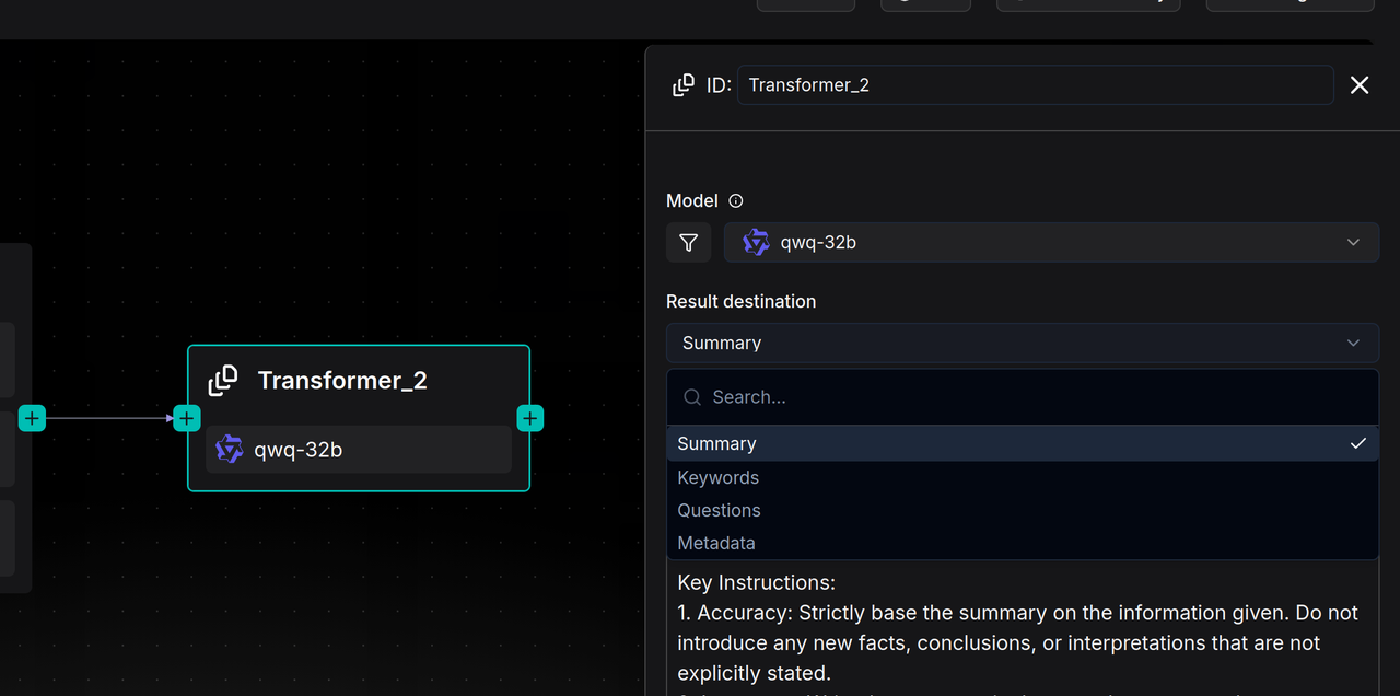 接下来,将 Transformer 节点的大模型切换至所需的模型,并将 “Result destination” 字段设置为 “Metadata” 。此配置意味着大模型对文本块的加工结果(如摘要)将直接存入文件的元数据中,为后续的精准检索与过滤提供能力支持。