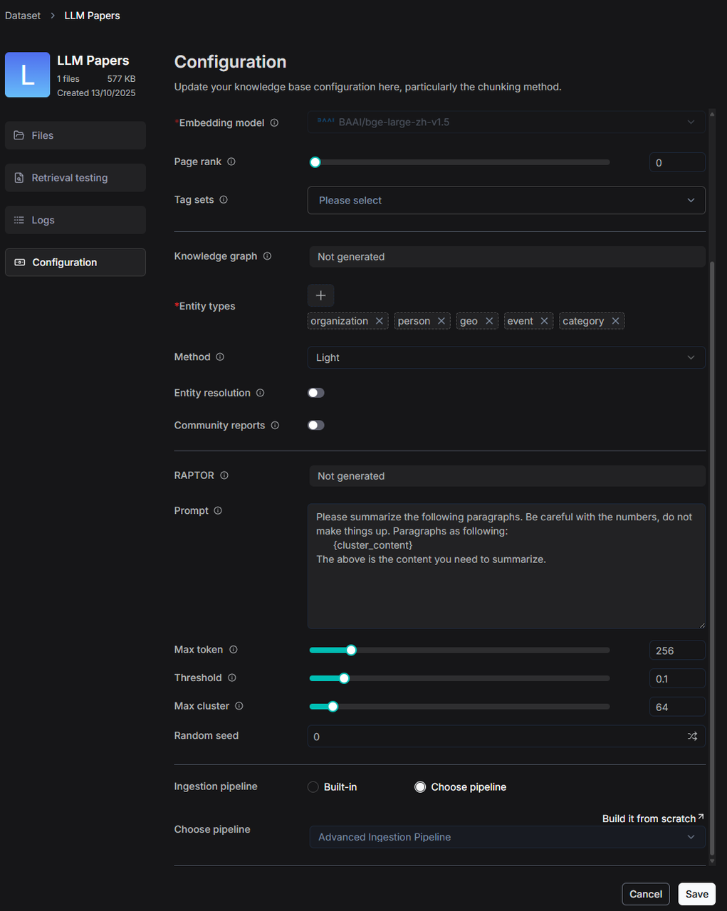 对于已创建的知识库,用户可随时进入其 “Ingestion pipeline” 模块,重新调整和选择关联的解析流程。