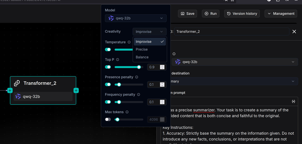 当前的 Transformer 算子支持摘要生成、关键词生成、问题生成和 Metadata 元数据生成等功能。 用户可以选择在 Pipeline 中编排该算子,来为原始数据补充这些内容,从而提升最终的检索准确度。与其他使用大模型的场景类似,Transformer 节点为大模型也设置了三种模式——Improvise 、Precise 和 Balance。