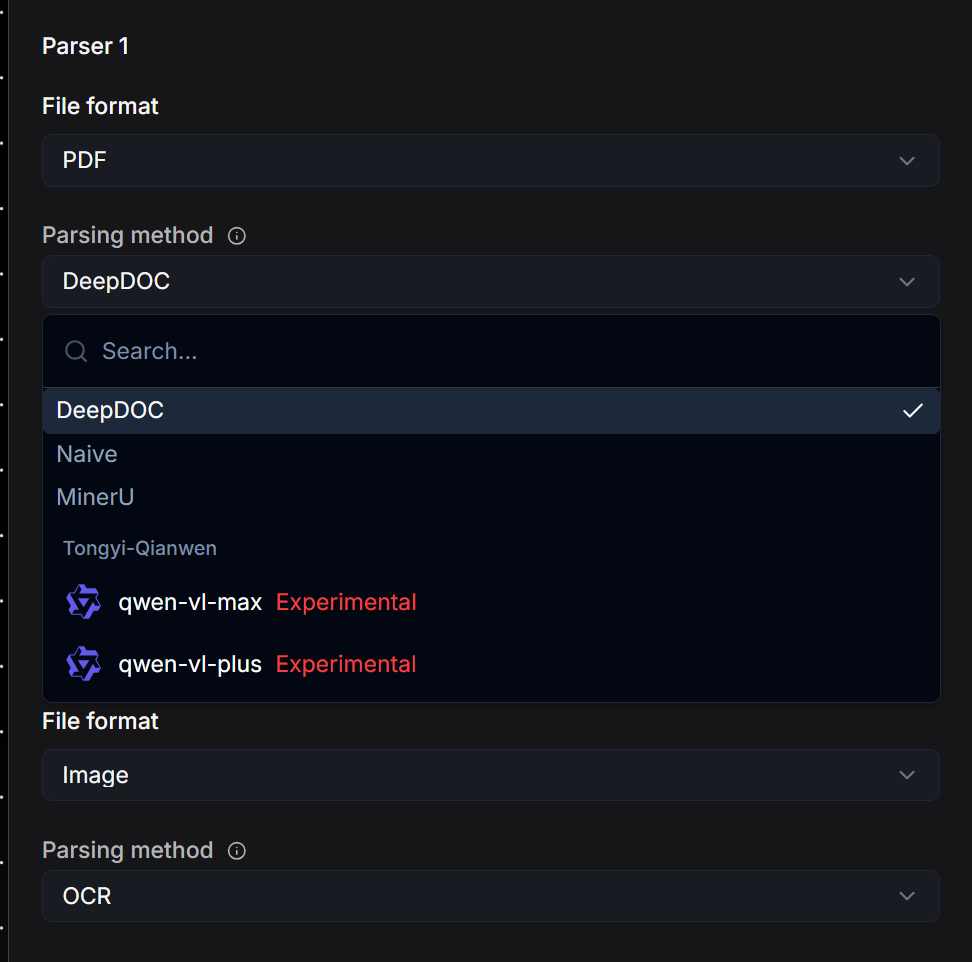 在使用时,只需在 Parser 节点内点击 “Add Parser”,选择需要的文件类别(如 PDF、Image 或者 PPT)。当Ingestion pipeline 运行时,Parser 节点会自动识别输入的文件,并将其路由到对应的 parser 进行解析。