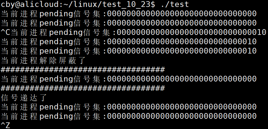 {// 防止解除屏蔽后信号递达进程直接退出看不到现象// 验证pending信号集是在递达前变化的// 定义pending信号集sigset_t pending;sigemptyset(&pending);// 获取当前进程的pending信号集,实际上就是将内核中的pending表拷贝到栈上的pending信号集中sigpending(&pending);// 打印pending信号集cout<<"##################################"<<endl;PrintPending(pending);cout<<"##################################"<<endl;//如果pending信号集在handler函数结束cout << "信号递达了" << endl;