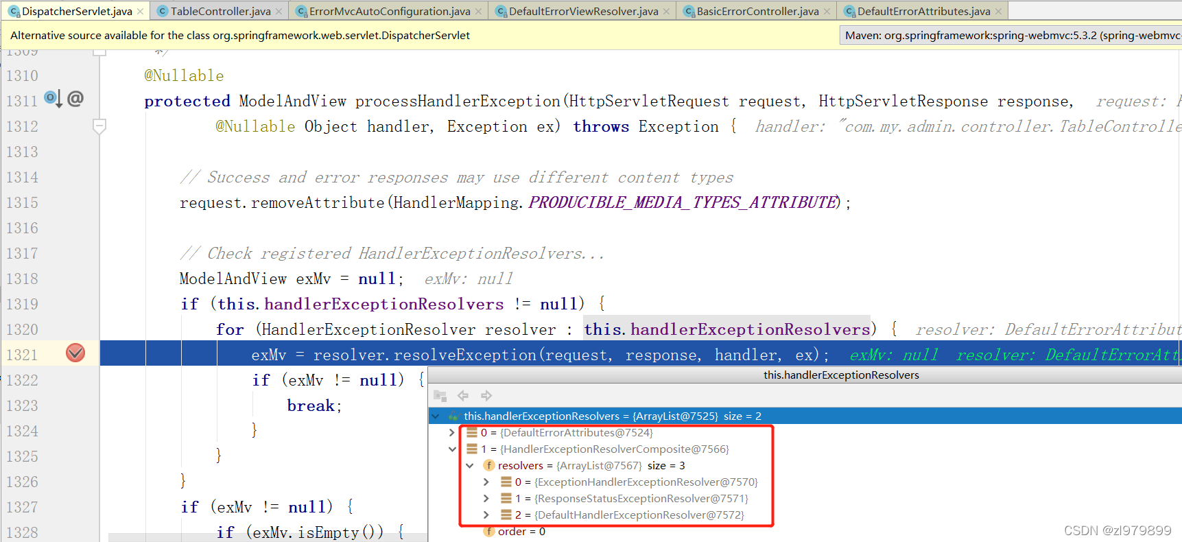 - 遍历所有的 handlerExceptionResolvers,看谁能处理当前异常【HandlerExceptionResolver处理器异常解析器】