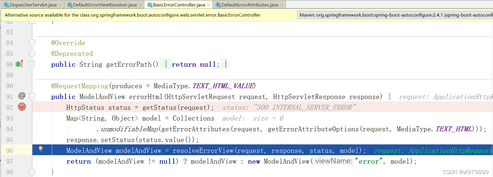 - 底层就会发送 /error 请求,会被BasicErrorController处理