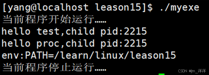 #include <stdio.h>int main() {printf("当前程序开始运行……\n");if(fork()==0){char* argv[]={"-a","-b","-c",NULL};char* envp[]={"TEST_PATH=/1/2/3",//避免与进程环境变量中的PATH重名,导致PATH的value值"NAME=YANG",NULL};extern char** environ; for(int i=0;envp[i];i++)putenv(envp[i]); //将自定义环境变量中的值插入到当前进程的环境变量中execvpe("./proc",argv,environ); //最后envp参数直接传入当前进程的环境变量environ}waitpid(-1,NULL,0);printf("当前程序停止运行……\n");return 0;
