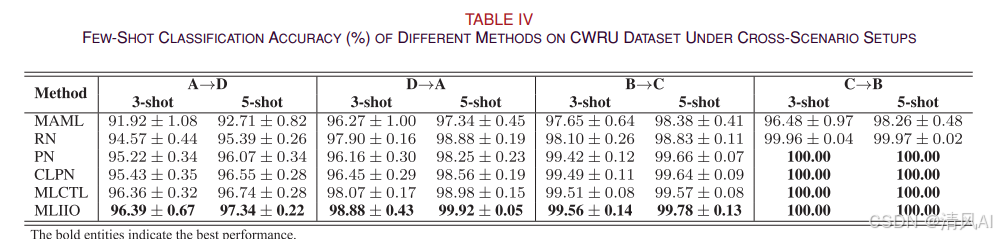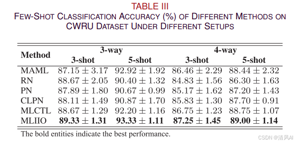 表III展示了不同方法在CWRU数据集上的少样本分类准确率: