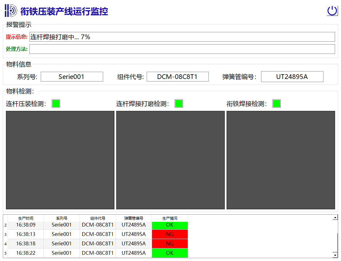 from Control_Centrial.Control_main import ProductionLineWorkerclass MainWindow(QMainWindow):def __init__(self, parent=None):super().__init__(parent)self.ui = Ui_MainWindow()self.ui.setupUi(self)self.setWindowTitle("衔铁压装产线运行监控")self.setWindowIcon(QIcon(f'{os.path.dirname(os.path.abspath(__file__))}\\photo\\hlc.jpg'))# 移除默认标题栏self.setWindowFlags(Qt.WindowType.FramelessWindowHint)# 创建新的中央部件# QMainWindow 永远不要直接设置布局,而是设置中央部件,然后在中央部件中设置布局self.setCentralWidget(self.ui.centralwidget) # 设置中央部件使得界面可缩放# 初始化工作线程self.workerThread = ProductionLineWorker()self.workerThread.start()# 连接信号槽self.connect_signals()def connect_signals(self):"""连接信号和槽"""# 连接信号槽self.ui.PowerButton.clicked.connect(lambda:self.close())# 连接工作线程信号到UI更新槽函数self.workerThread.status_update.connect(self.update_status)self.workerThread.data_update.connect(self.update_data_display)# 槽函数 - 更新UIdef update_status(self, status,deals):"""更新状态显示"""self.ui.lineEdit_errInfo.setText(status)self.ui.lineEdit_deal.setText(deals) def update_data_display(self, index,data): if index == 1:self.ui.lineEdit_1.setText(data['Serie'])self.ui.lineEdit_2.setText(data['product_id'])self.ui.lineEdit_3.setText(data['Encoding'])if index == 2:self.add_table_data(data)self.ui.lineEdit_1.clear()self.ui.lineEdit_2.clear()self.ui.lineEdit_3.clear()def add_table_data(self, data_dict):"""添加数据到表格"""# 获取当前行数current_row = self.ui.tableWidget.rowCount()# 插入新行self.ui.tableWidget.insertRow(current_row) # 填充数据self.ui.tableWidget.setItem(current_row, 0, QTableWidgetItem(data_dict.get('timestamp', '')))self.ui.tableWidget.setItem(current_row, 1, QTableWidgetItem(data_dict.get('Serie', '')))self.ui.tableWidget.setItem(current_row, 2, QTableWidgetItem(data_dict.get('product_id', '')))self.ui.tableWidget.setItem(current_row, 3, QTableWidgetItem(data_dict.get('Encoding', '')))# 质量状态列,可以设置颜色quality_item = QTableWidgetItem(data_dict.get('quality', ''))if data_dict.get('quality') == 'OK':quality_item.setBackground(Qt.green)elif data_dict.get('quality') == 'NG':quality_item.setBackground(Qt.red)self.ui.tableWidget.setItem(current_row, 4, quality_item)# 设置水平和垂直都居中for col in range(self.ui.tableWidget.columnCount()):item = self.ui.tableWidget.item(current_row, col)if item is not None:item.setTextAlignment(Qt.AlignCenter) # 水平和垂直都居中# 自动滚动到最后一行self.ui.tableWidget.scrollToBottom()# 限制表格最大行数if self.ui.tableWidget.rowCount() > 100:self.ui.tableWidget.removeRow(0) # 删除第一行def delete_selected_row(self):"""删除选中的行"""current_row = self.ui.tableWidget.currentRow()if current_row >= 0:self.ui.tableWidget.removeRow(current_row)def delete_all_rows(self):"""删除所有行"""self.ui.tableWidget.setRowCount(0) if __name__ == '__main__':app = QtWidgets.QApplication(sys.argv)win = MainWindow()win.show()app.exit(app.exec()) 3、编写后台工作线程,并实现与主程序通讯更新界面显示: