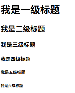 <h1>我是一级标题</h1><h2>我是二级标题</h2><h3>我是三级标题</h3><h4>我是四级标题</h4><h5>我是五级标题</h5><h6>我是六级标题</h6>