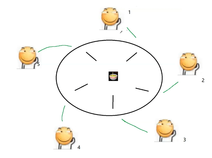 描述 5 位哲学家围坐在圆桌旁,每人左右各有一根筷子,思考时放下筷子,就餐时需要同时拿起左右两根筷子。若每位哲学家同时拿起左手筷子,再等待右手筷子,会导致所有人都持有一根筷子并等待另一根,形成死锁。