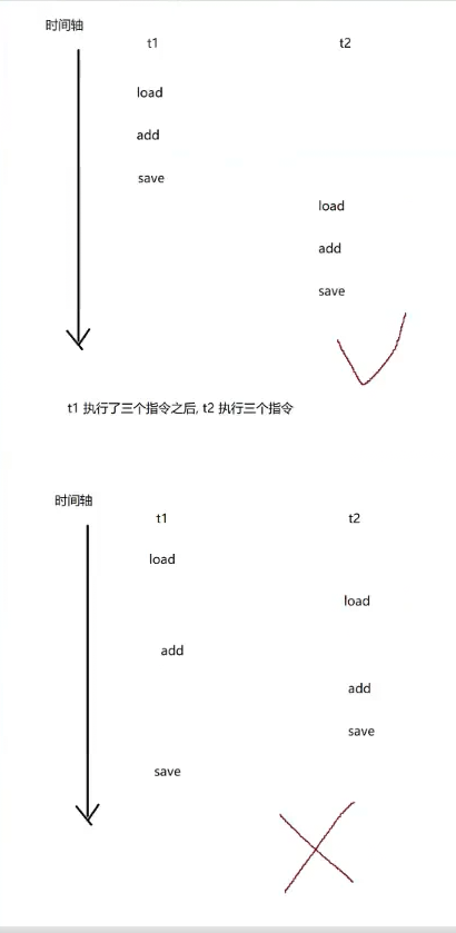 此时两个线程的并发执行,就相当于两组load add save指令并发执行。所以这两组指令的执行顺序存在了许多可能性。