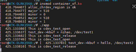 struct device_test dev1;//定义设备结构体变量dev1 struct device_test dev2;//定义设备结构体变量dev2//open函数实现,在那个file结构体找 static int cdev_test_open(struct inode *inode, struct file *file) {dev1.minor = 0; //次设备号赋值为0dev2.minor = 1; //次设备号赋值为1//inode->i_rdev 为该 inode 的设备号,使用container_of函数找到结构体变量dev1 dev2的地址 //然后设置私有数据file->private_data = container_of(inode->i_cdev, struct device_test, cdev_test); printk("This is cdev_test_open\r\n");return 0; }if (test_dev->minor == 0) //次设备号为0{if (copy_to_user(buf, test_dev->kbuf, strlen(test_dev->kbuf)) != 0) //从内核空间拷贝数据到用户空间{printk("copy_to_user is error\n");return -1;}}else if (test_dev->minor == 1) //次设备号为1{if (copy_to_user(buf, test_dev->kbuf, size) != 0) //从内核空间拷贝数据到用户空间{printk("copy_to_user is error\n");return -1;}}if (test_dev->minor == 0) //次设备号为0{if (copy_from_user(test_dev->kbuf, buf, size) != 0)//从用户空间拷贝数据到内核空间{printk("copy_from_user is error\n");return -1;}printk("test_dev->kbuf = %s\r\n", test_dev->kbuf);}else if (test_dev->minor == 1) //次设备号为1{if (copy_from_user(test_dev->kbuf, buf, size) != 0)//从用户空间拷贝数据到内核空间{printk("copy_from_user is error\n");return -1;}printk("test_dev->kbuf = %s\r\n", test_dev->kbuf);}