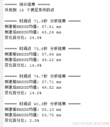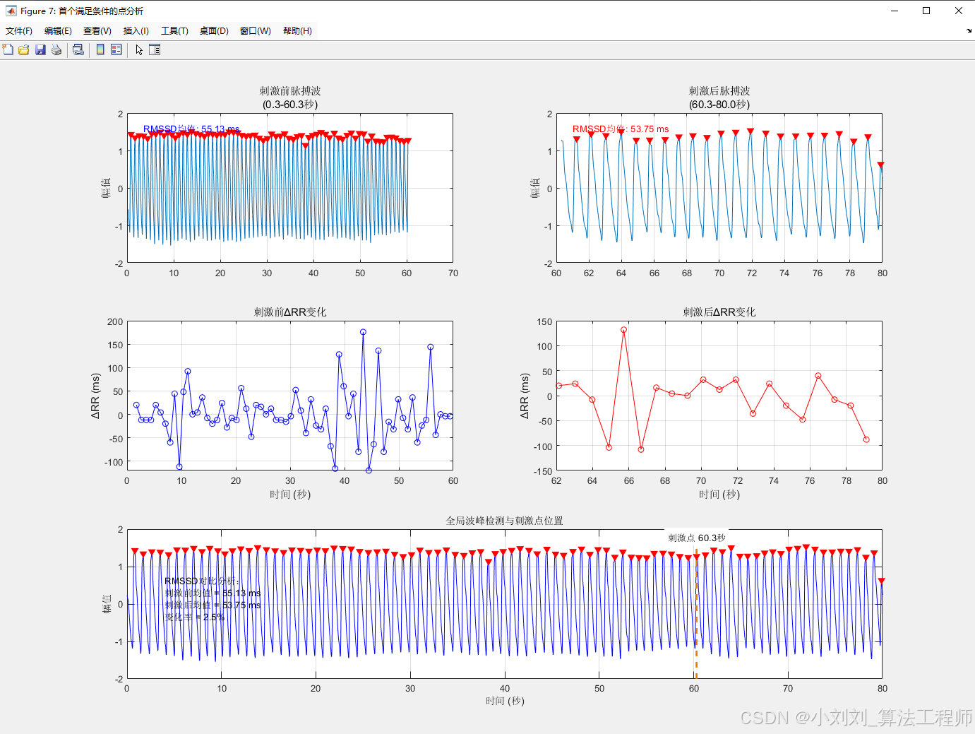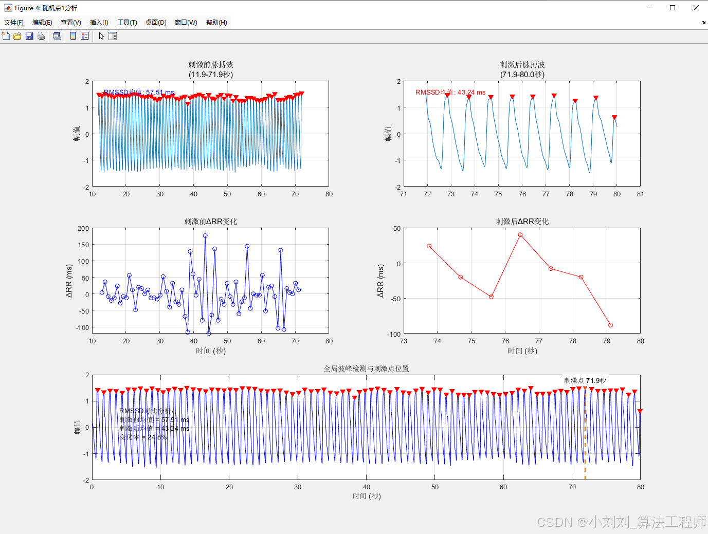 - 计算刺激前后 60 秒窗口内的 RMSSD 指标,结合统计检验验证差异显著性。