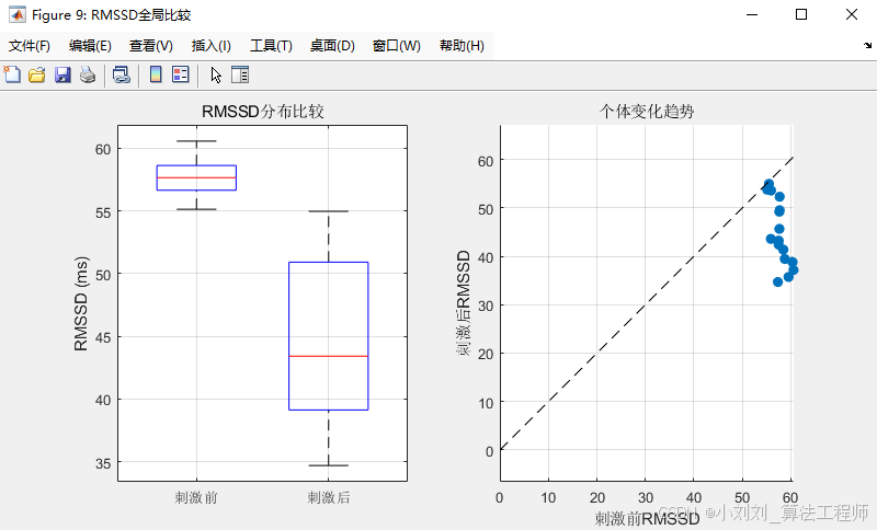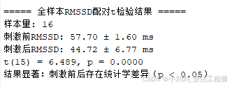 - 异常值:刺激后箱线图未出现明显异常值,表明即使存在个体差异,所有样本的 RMSSD 变化仍在生理合理范围内,数据可靠性较高。